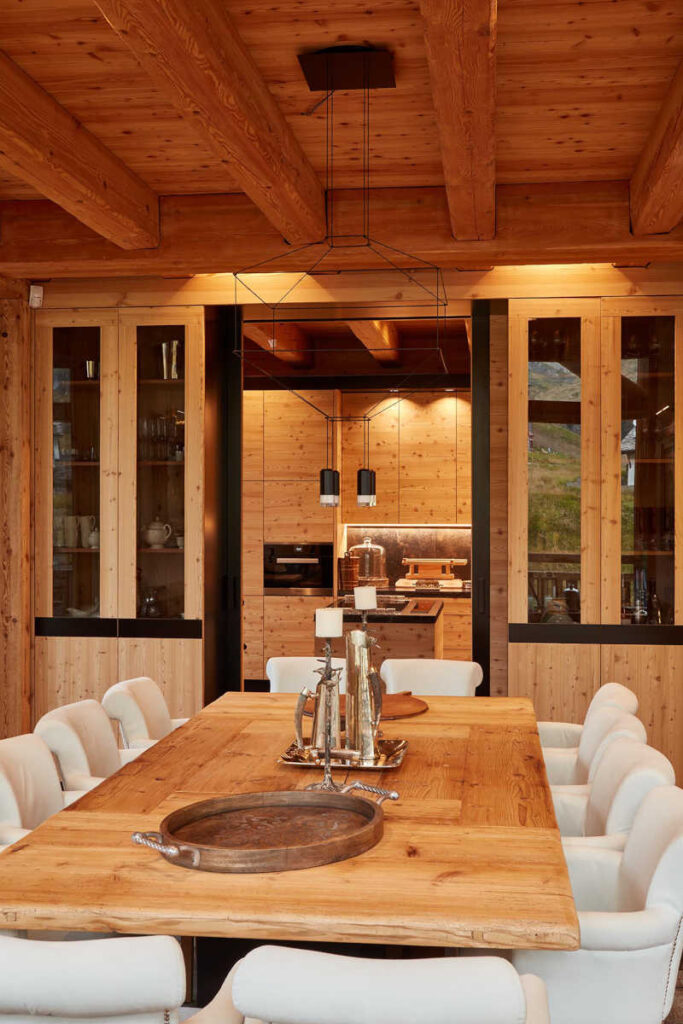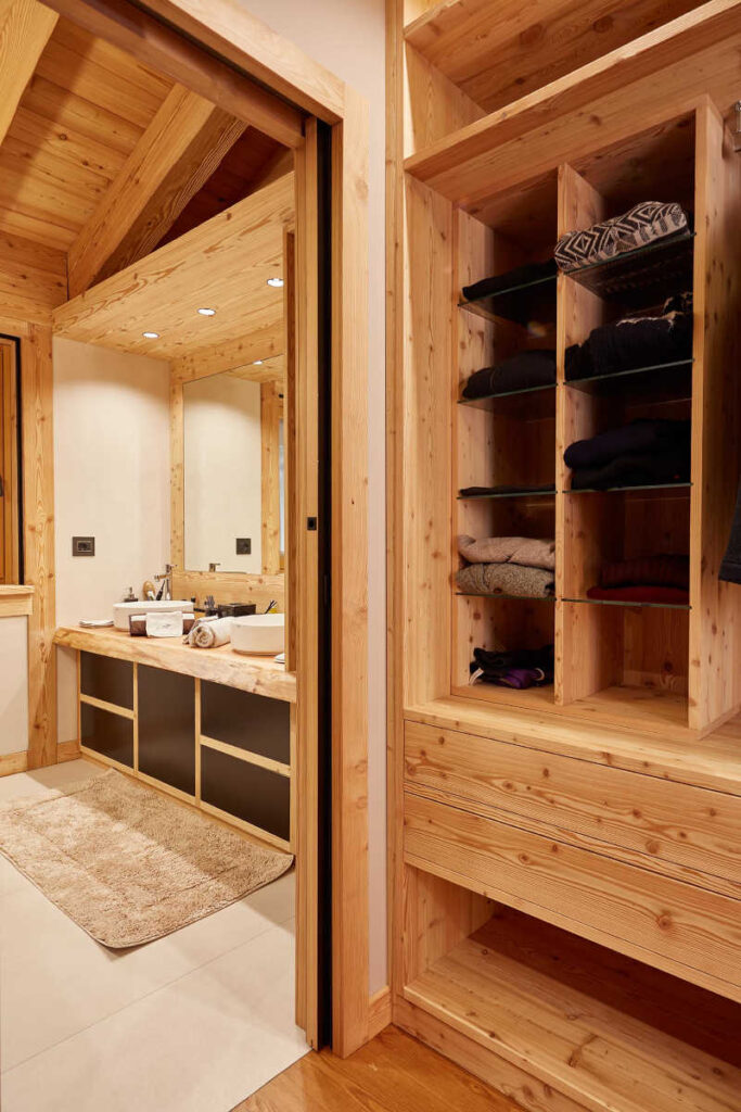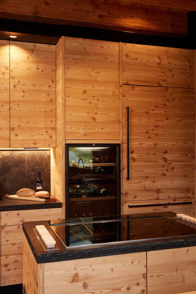 Il desiderio dei proprietari era di avere uno chalet di lusso che rispecchiasse la tradizione delle case di montagna pur integrando funzioni e finiture moderne, impiegando principalmente legno di larice grezzo (con finitura spazzolata all’interno, bio all’esterno), senza alcuna finitura superficiale, in modo che invecchiasse insieme a loro; una scelta che ha riguardato sia le superfici sia gli arredi, quasi tutti realizzati artigianalmente su disegno.