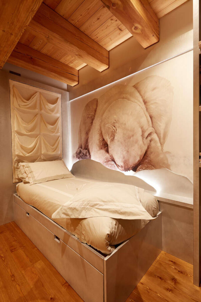 Nella camera del figlio più piccolo, ai piedi del letto che ne nasconde un secondo all’interno del cassettone, c’è l’accesso “segreto” a una porzione della capriata aggettante da dove, attraverso un oblò, si può gettare lo sguardo sulla zona pianoforte-divani. Il poster dell’orso è frutto di una fotografia ingrandita e riprodotta su tela, illuminata dal basso da fonti nascoste in una sede ricavata appositamente nel legno.