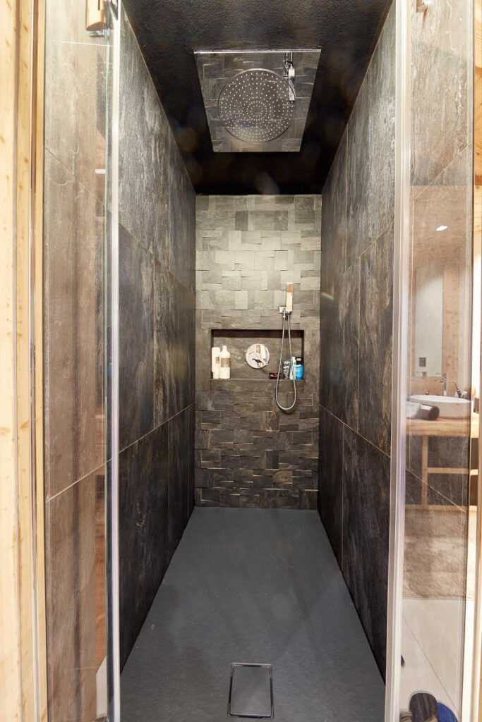 Al piano interrato, sotto il soggiorno, il palco su cui è posta la vasca idromassaggio è l’unica superficie per la quale è stato utilizzato un legno diverso, ovvero teak, di per sé più resistente all’acqua “trattata” della spa; sopra la vasca, dalle pareti rivestite in pietra emergono due bocche a cascata. Per praticità, a questo livello i pavimenti sono in grès effetto legno.