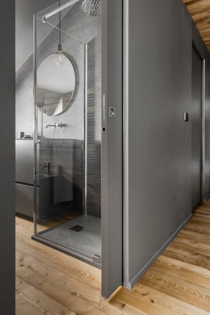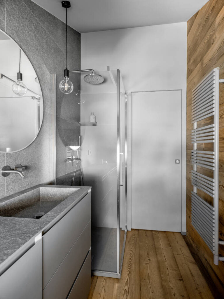 In questo miniappartamento in montagna, la nuova disposizione dei sanitari secondo uno schema più razionale e la sostituzione della vasca a favore della doccia hanno reso necessario spostare la porta di accesso qualche decina di centimetri verso la zona giorno: il pavimento in legno si insinua anche in questo ambiente risalendo la parete di fondo e quella dei sanitari, mentre la parete laterale è rivestita con maxilastre effetto porfido di Kronos Ceramiche.