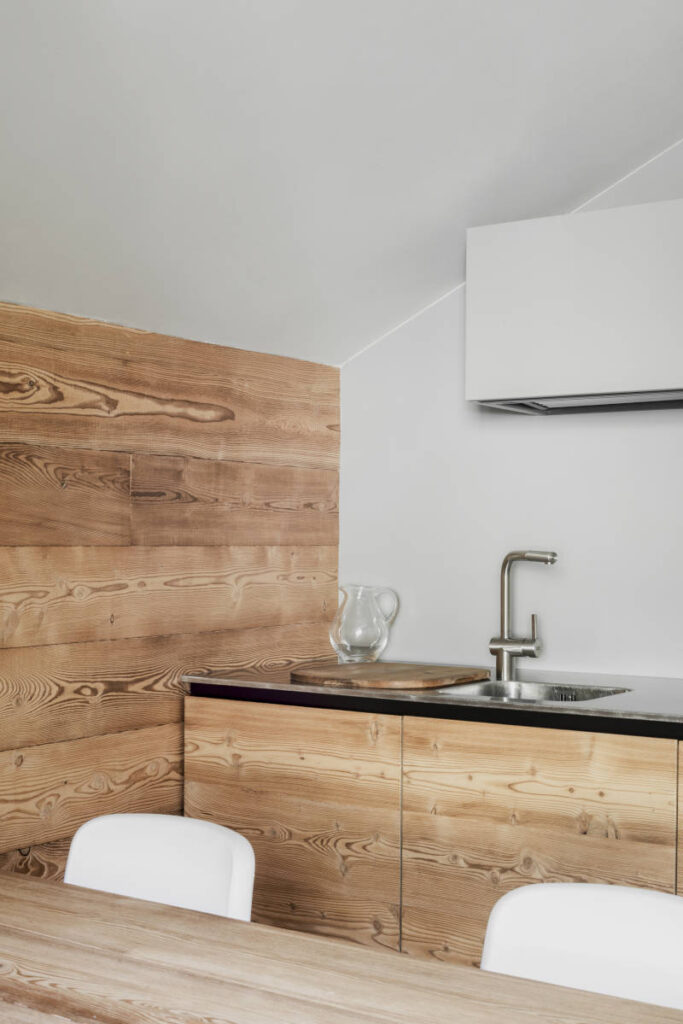 La zona giorno di questo miniappartamento in montagna è uno spazio aperto che racchiude le funzioni cucina, pranzo e relax, con divano letto. Qui, come negli altri ambienti, nel pavimento preesistente in ceramica sono state aperte le tracce per i nuovi impianti e sopra di esso sono state posate doghe di larice massello con finitura spazzolata spesse 20 mm, utilizzate anche per realizzare gli arredi su disegno e per rivestire le pareti, dopo aver rimosso il rivestimento in piastrelle della zona cucina e le perline in legno di pino.