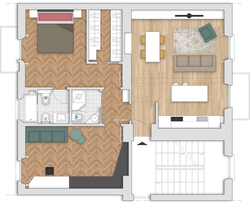 Una caratteristica ricorrente nelle case di quest’epoca, oltre ai classici “stanzoni”, è la mancanza di una netta separazione tra ambienti giorno e notte: le due camere erano in posizione contrapposta, come pure cucina e soggiorno, per dare una disposizione più consona è stato sufficiente invertire la posizione del soggiorno e della camera a fianco della cucina. La camera da letto è diventata una piccola suite, con cabina armadio e bagno privato; la nuova distribuzione consente anche a entrambi i proprietari di lavorare da casa con postazioni separate e senza interferenze acustiche, uno in soggiorno e l’altro nello studio.