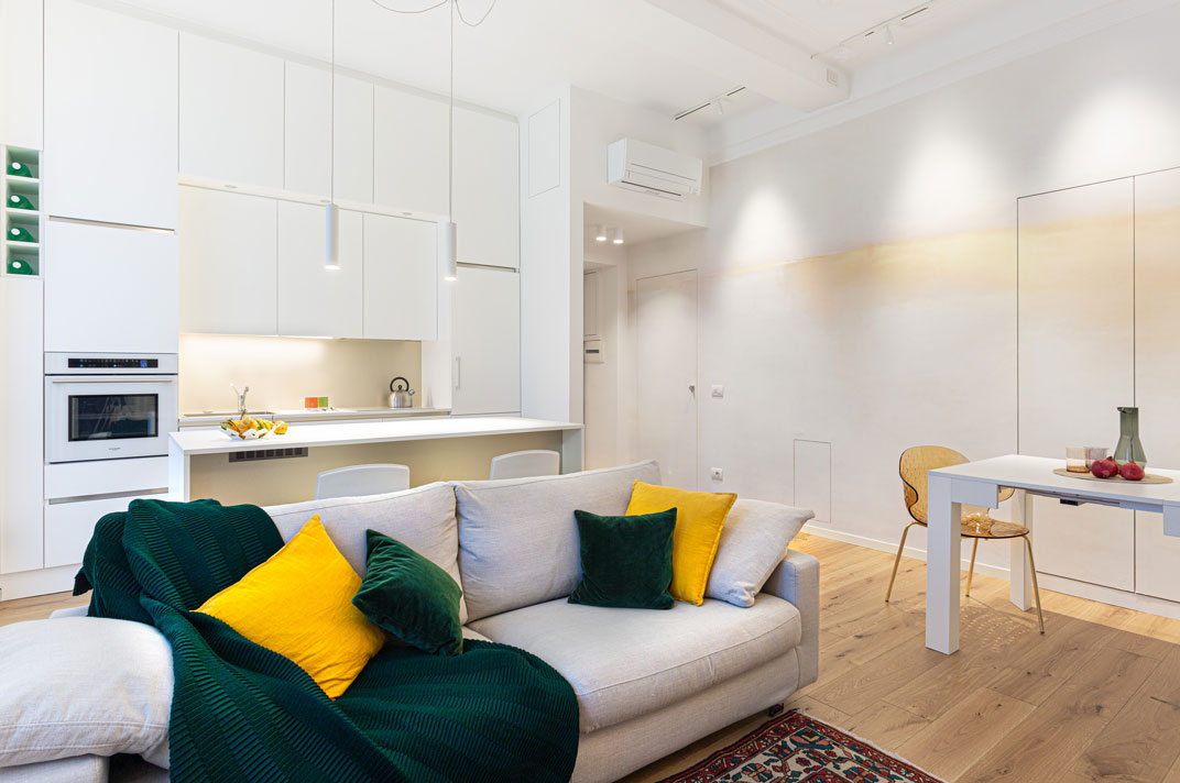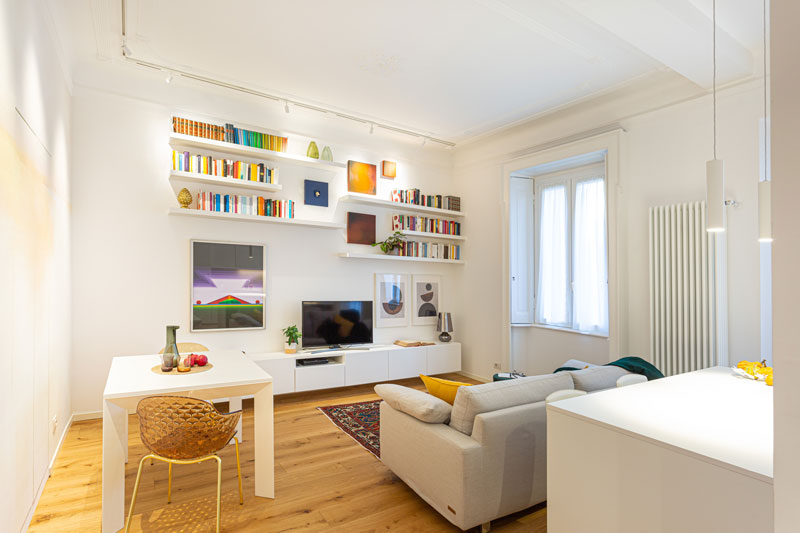 Un appartamento degli anni ’20 trascurato a lungo e ora ristrutturato seguendo uno stile ricercato e senza eccessi, dove il bianco domina e si presta come sfondo per far risaltare i tocchi di colore dei complementi d’arredo e di alcuni oggetti di design
