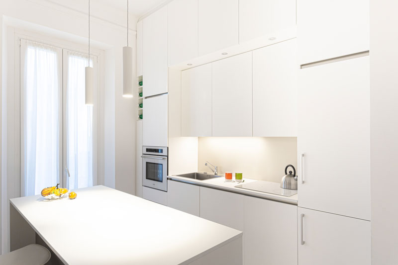 La cucina, in finitura laccata, è realizzata artigianalmente su progetto, con pensili a doppia profondità che permettono anche di creare diversi scenari luminosi. Lo schienale e il pannello sotto il bancone sono in fenix effetto metallo color oro, un richiamo cromatico alla carta da parati. Gli elettrodomestici sono stati scelti con frontale di colore bianco per integrarli con meno impatto nella composizione; le uniche due maniglie sono quelle del frigorifero e del freezer a destra. In alto, sulla spalletta che separa la cucina dall’ingresso, si può notare un’altra chiusura a filo che permette di accedere a un ripostiglio in quota, mentre nel pensile in alto a sinistra è nascosta la caldaia a condensazione.