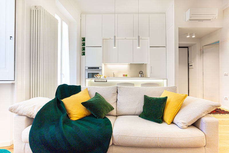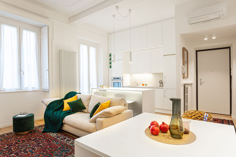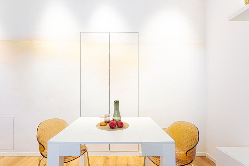 L’ingresso è stato ridotto all’essenziale e affaccia direttamente sulla zona giorno, uno spazio destinato alla convivialità: anche per questo motivo davanti alla cucina è stato posto un bancone, non una vera “isola”, che si presta per colazioni e aperitivi in quanto sul lato posteriore incorpora una cantinetta per i vini. Nella parete a lato dell’ingresso si mimetizzano diverse chiusure a filo: la porta che separa dalla zona notte, un vano tecnico e un armadio a muro ricavato dalla chiusura di una nicchia, originata anni prima con la chiusura del passaggio tra due stanze. Questa parete è rivestita con la carta da parati D’Oro di Glamora a soggetto astratto, sembra una delicata nuvola dorata, d’altra parte l’ambiente ha già una palette cromatica abbastanza ricca. Le sospensioni sul bancone della cucina sono Axiom di Rossini.