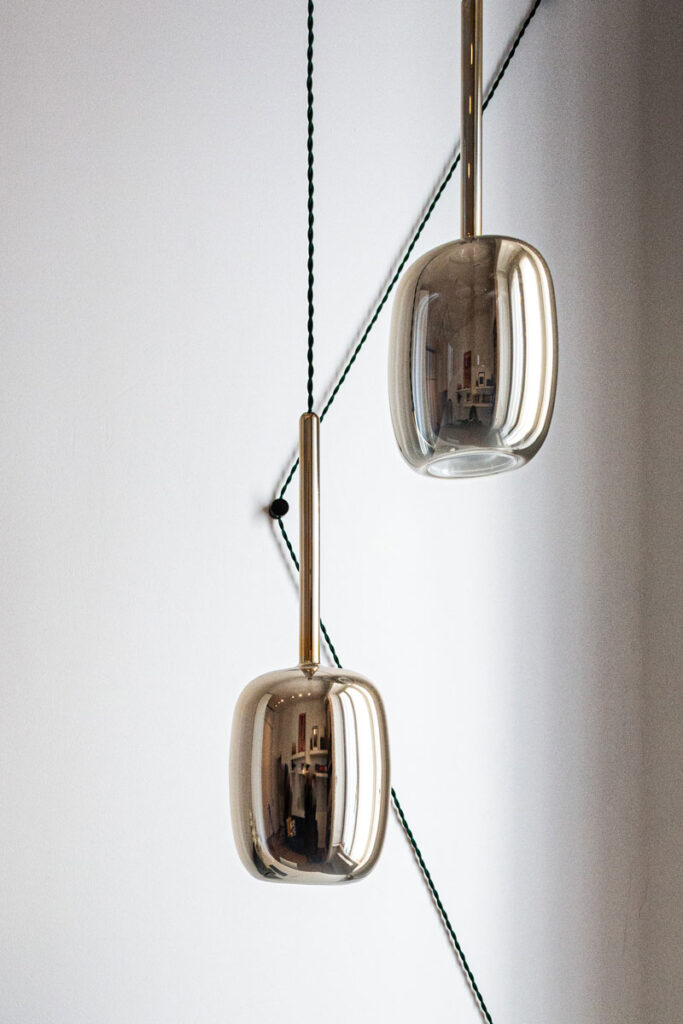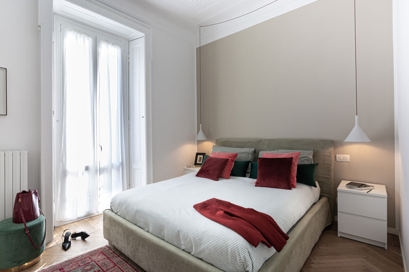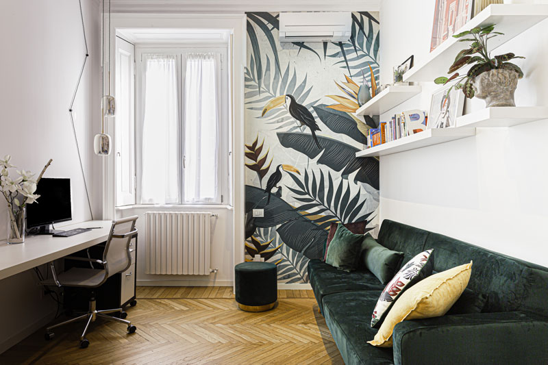 Nello studio e nella camera da letto è stato possibile recuperare il parquet originale attraverso una lamatura e una nuova finitura superficiale, un pavimento con schema a fascia e bindello e tappeto centrale in listelli posati a spina italiana. La parete a lato della finestra è rivestita con la carta da parati Jungle Dream White di Officinarkitettura; oltre la scrivania, è stata collocata un’armadiatura realizzata su progetto che si estende fino alla porta (si vede solo nella planimetria) e offre molto spazio di stoccaggio. Un altro dettaglio che accomuna studio e camera da letto è dato dalle lampade a sospensione di Rossini (qui il modello Gioia, in camera modello Asia), alimentate tramite un cavo a treccia che rievoca gli impianti a vista del passato; a questo escamotage si è fatto ricorso anche per salvaguardare gli stucchi dei soffitti.