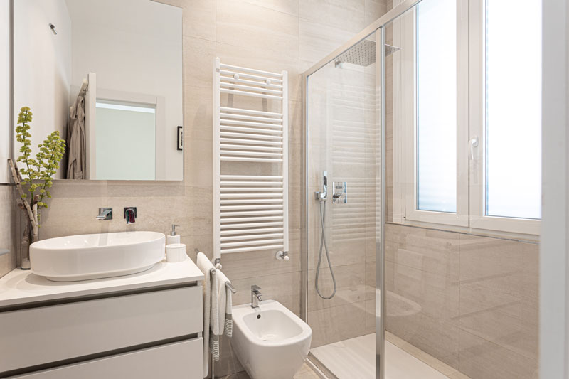 Il bagno di servizio è cieco e decisamente piccolo, ma con l’aiuto del falegname è stato possibile inserire i sanitari essenziali, con il lavabo appoggiato su una base triangolare contrapposto a un’armadiatura a base pentagonale che racchiude lavatrice e asciugatrice sovrapposte, una scaffalatura per i prodotti e i cesti per la biancheria. Anche nel bagno principale si è dovuto centellinare lo spazio, per dare prevalenza a una comoda doccia a tutta larghezza, davanti alla finestra. I due bagni sono accomunati dai rivestimenti ceramici di Ceramiche Caesar, dai sanitari di Pozzi Ginori e dagli specchi che integrano un minuscolo faretto Mini Tini di DGA.