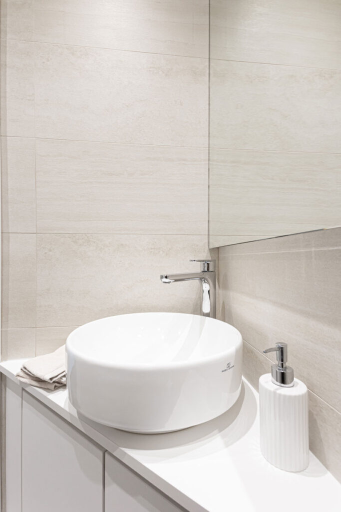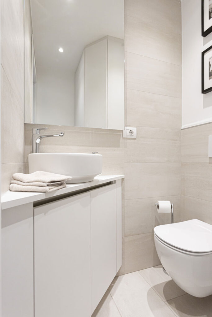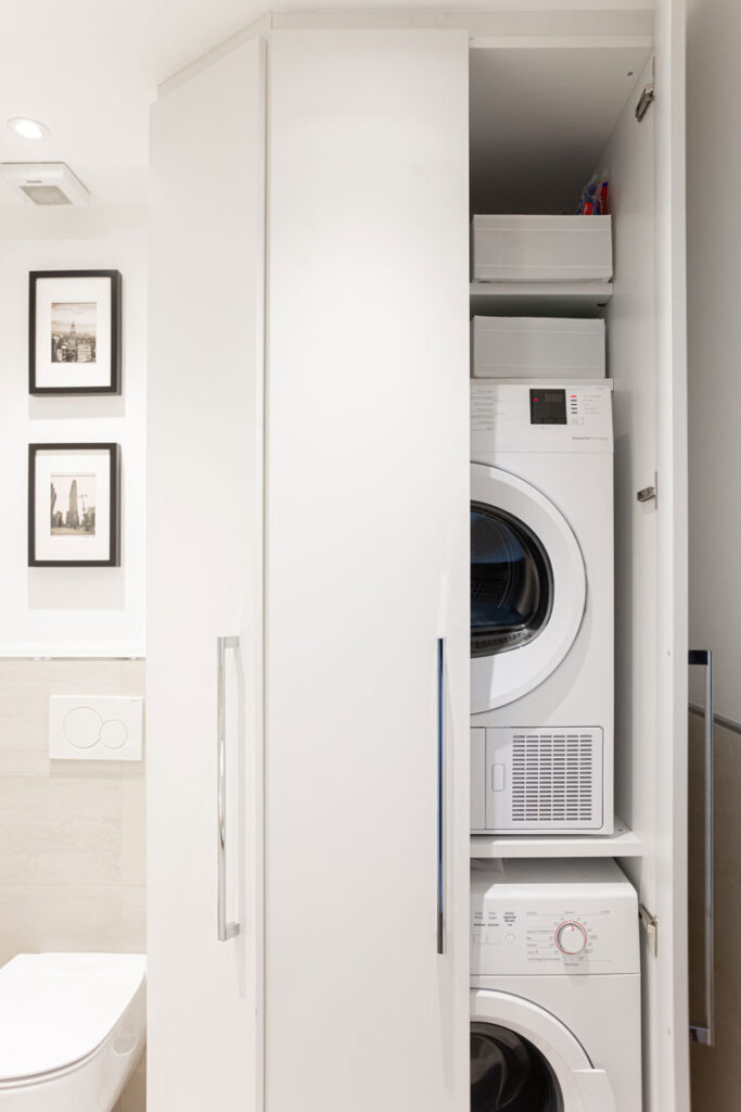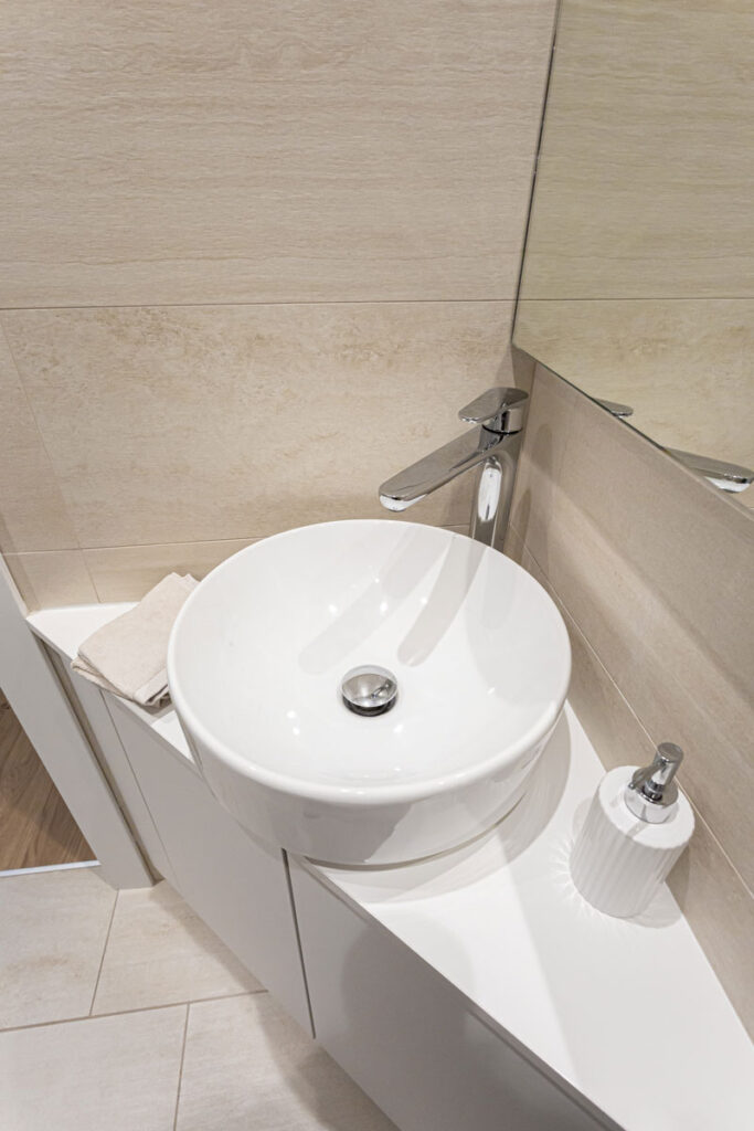 Capita spesso che, in situazioni come queste, si decida di demolire i muri divisori e ridisegnare completamente gli interni, ma dovendosi confrontare con murature portanti e con un’unica colonna di scarico non era possibile intervenire radicalmente e rimanere all’interno di un budget ragionevole. La cucina perciò è rimasta dov’era, ma demolendo il tramezzo tra questa e una camera, e riducendo a una sorta di vestibolo il corridoio d’ingresso, si è potuto creare una zona giorno abbastanza ampia; nello spazio del bagno preesistente, incrementato da un’altra porzione di corridoio, è stato possibile ricavare un bagno principale, collegato direttamente alla camera da letto, e un bagno cieco di servizio con lavanderia nascosta.