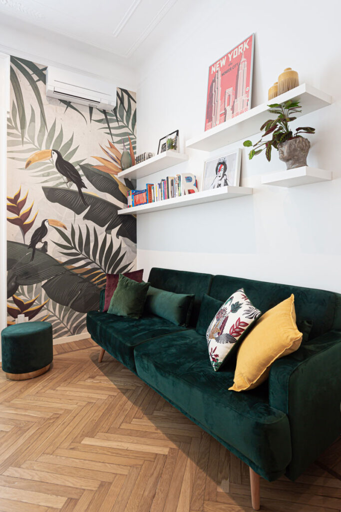 Per rendere l’appartamento accattivante e giovane si è lavorato molto sui dettagli, con l’utilizzo di carte da parati e lampade di design, qualche opera d’arte moderna, complementi di Maison du Monde e, per sfruttare al meglio gli spazi, molte soluzioni d’arredo realizzate su misura di falegnameria.