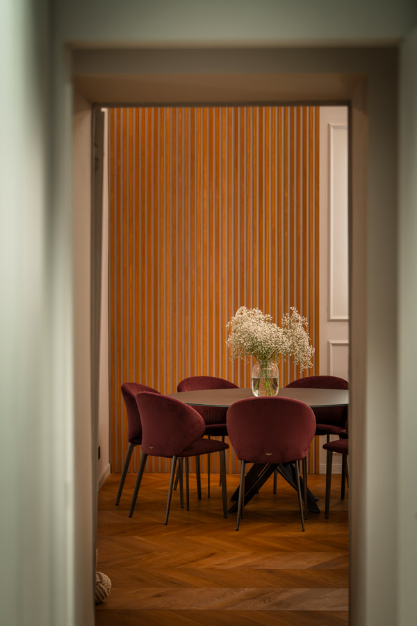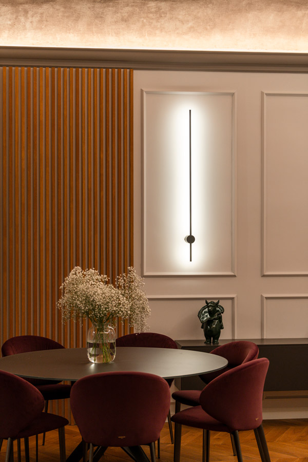 Il punto forte dell’abitazione è il salone, dove l’imponenza del soffitto a volta è evidenziata dalla struttura leggera dell’anello luminoso Lancia Tonda di Egoluce nella versione Ø 300 cm in finitura bronzo, volutamente posizionato in obliquo e sostenuto da esili cavi d’acciaio. I decori agli angoli della volta sono quelli originali in stucco, ma dei segmenti che li univano non c’erano che pochi pezzi: è stato possibile ripristinarli utilizzando i profili Z10 Artstyl®, interponendo sulla mezzeria di ciascun segmento il decoro Z104. Gli stessi profili sono stati utilizzati, tagliati a 45°, per formare riquadri sulla parete e ottenere un effetto boiserie, verniciandoli nella stessa tonalità grigio perla. Per delimitare idealmente la zona pranzo, invece, è stato tassellato a parete un pannello di MDF verniciato grigio perla sul quale sono stati applicati, a interassi regolari sottili listelli di legno ottenendo un effetto cannettato, rifiniti a olio come il parquet in massello di Tolin incollato a spina ungherese in tutta la casa. Le tinteggiature sono tutte realizzate a tintometro, prendendo come base il colore degli arredi.