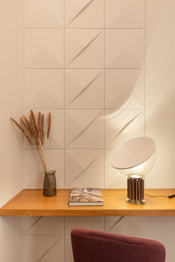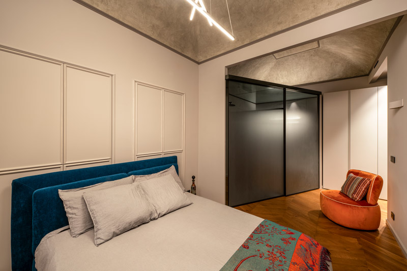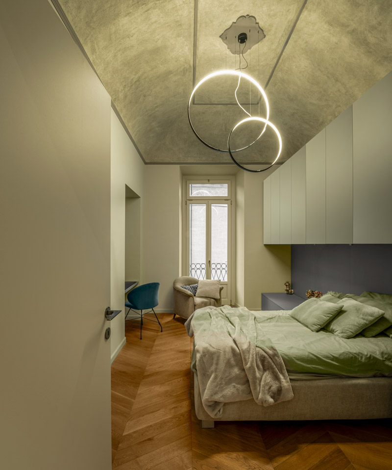 Nell’ingresso, per evidenziare la volta, è stato utilizzato il profilo IL9 Memory Artstyl® di Noel&Marquet sagomato in modo da accogliere una fonte di illuminazione indiretta, premiato con il Red Dot Design Award nel 2020. I prodotti Artstyl® sono realizzati in schiuma poliuretanica rigida ad alta densità e sono verniciabili, si installano con l’apposito adesivo Adefix® a corredo. Nell’angolo a lato della porta d’ingresso è stata posta una mensola in legno che fa da svuotatasche, ma all’occorrenza può essere utilizzata anche come postazione di lavoro; su questa porzione di parete è realizzato un rivestimento tridimensionale con gli elementi Puzzle Artstyl® 38x38x3,1 cm, che possono essere applicati in più modi per ottenere diversi effetti di luci e ombre. Due porte rasomuro chiudono il bagno degli ospiti e la cabina armadio che include anche una cappottiera per gli ospiti. Le volte sono presenti in tutte le stanze, anche nella cabina armadio; sono state trattate con una finitura materica applicata a più strati in due colori differenziati tra zone giorno e zone notte. Le porte originali sono state restaurate, quelle nuove rasomuro sono tinteggiate come le pareti.