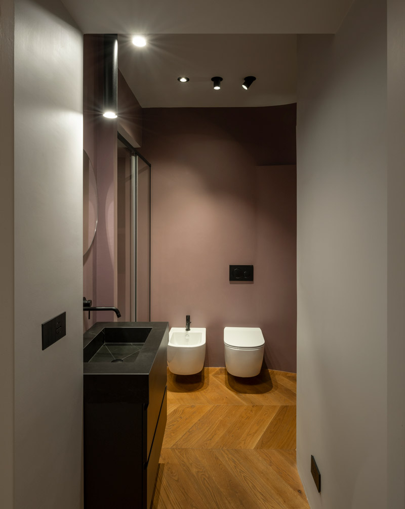 Quanto ai pavimenti, non pregiati, sono stati completamente demoliti per realizzare i nuovi impianti e predisporre un sistema di riscaldamento radiante alimentato da una caldaia a condensazione, vista l’impossibilità, dato il contesto, di installare una pompa di calore. Per il raffrescamento è stato invece realizzato un impianto canalizzato ad aria con unità nascosta nel controsoffitto del disimpegno centrale; le tubazioni passano all’interno di canne fumarie dismesse e raggiungono le bocchette di diffusione, predisposte nel soggiorno e nelle camere.