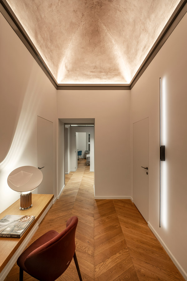 Ma l’obiettivo del progetto, come già accennato, era quello di mantenere gli elementi d’epoca, nella fattispecie le volte, e arricchire gli spazi con alcuni dettagli contemporanei. In questo hanno avuto un ruolo importante i prodotti di Noel&Marquet, utilizzati in forma di profili per ottenere effetti boiserie alle pareti, per raccordarsi con i decori originali in stucco delle volte, per le cornici con retroilluminazione, per i battiscopa.