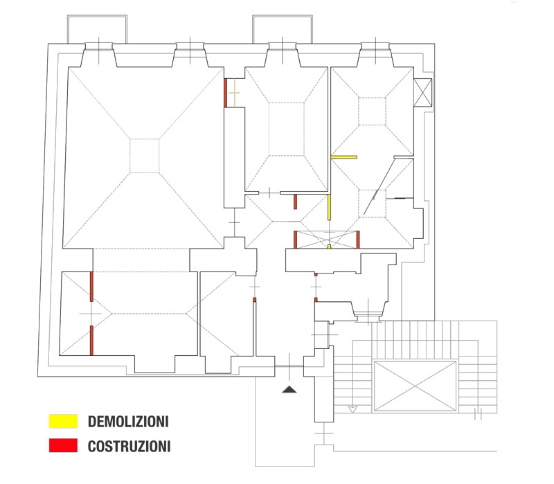 La ripartizione determinata dalle murature portanti e il loro spessore porta a ipotizzare che in origine la porzione di casa costituita da camere e disimpegno fosse un unico grande ambiente, come il soggiorno; in concomitanza con un successivo frazionamento di questa porzione, il soffitto venne ripensato e suddiviso in più volte a misura delle nuove camere, realizzando una sorta di controsoffitto in cannicciato. Nello stato ante operam le volte erano tinteggiate di bianco; prima di procedere con la preparazione del fondo per le finiture materiche sono stati effettuati assaggi per assicurarsi che sotto lo strato di pittura non fossero nascoste superfici affrescate potenzialmente interessanti e recuperabili.