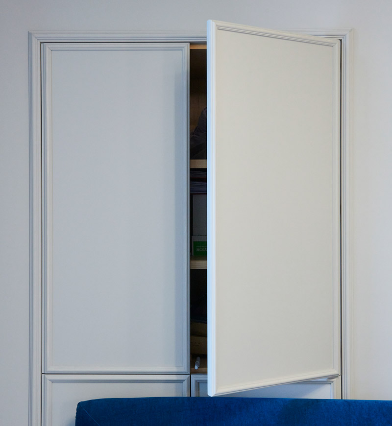 La parete dietro il letto si presenta come una boiserie, grazie all’impiego dei profili di Noel&Marquet, ma nella parte verso la finestra nasconde un armadio a muro, preesistente e ripreso dal falegname per rinnovarlo e renderlo invisibile. Infatti, i profili ricadono perfettamente a filo esterno degli sportelli coprendo la fessura tra questi e la parete.