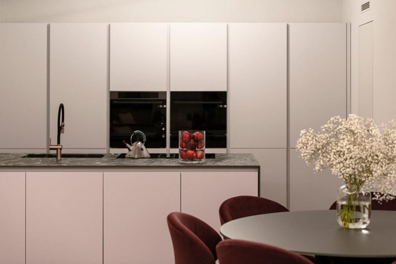 La cucina è separata dal salone solo da un ampio arco ed è configurata in linea a colonne, senza pensili, personalizzata con gole e zoccolo laccati in tinta con le ante; davanti un’isola da 270×125 cm con top in Laminam verde Alpi bocciardato e vasca integrata, completata dal rubinetto Inedito di Gessi e da un piano a induzione con cappa integrata. Per quest’ultima, essendo un modello aspirante e non filtrante, le tubazioni di evacuazione dei fumi sono state incanalate nel pavimento e fatte risalire nella parete che separa la cucina dalla lavanderia, fino alla canna fumaria che sale a tetto. Adattare apparecchiature come queste, concepite per abitazioni moderne, a case d’epoca è quasi sempre piuttosto impegnativo. Sopra le colonne, una veletta in cartongesso cela le tubazioni del sistema di aspirazione forzata a servizio della lavanderia e potrebbe risultare funzionale all’inserimento di un’illuminazione nascosta. In tutta la casa come battiscopa è stato utilizzato il modello FL1 Wallstyl® di Noel&Marquet in materiale polimerico estruso ad alta densità, impemeabile e resistente agli urti, con uno spazio posteriore per il passaggio degli impianti elettrici. Il battiscopa è stato verniciato in tinta con le pareti e si armonizza perfettamente con il pavimento in legno.