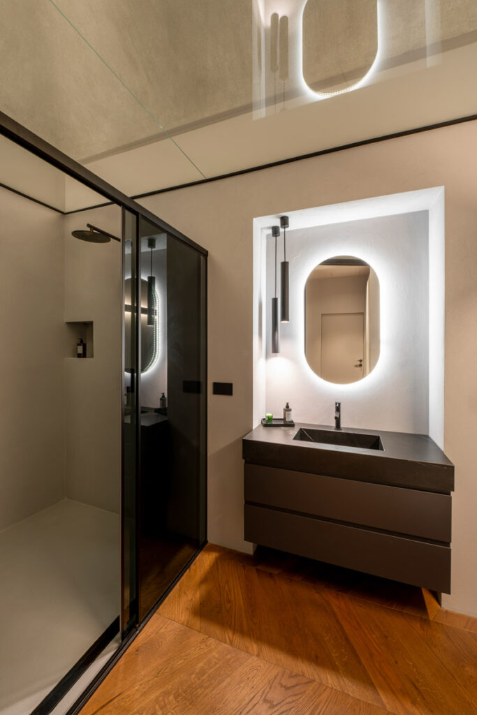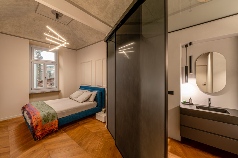 Nella camera padronale, gli elementi classicheggianti delle volte e delle cornici si contrappongono all’impostazione del bagno, decisamente moderna. Data la pianta a L della stanza, il limite del bagno si presenta obliquo per consentire un comodo passaggio dall’anticamera, in parte occupata da un armadio, alla zona riposo. Tale limite è costituito da un pannello fisso e uno scorrevole in vetro fumè su misura, con finitura acidata fino a un’altezza di circa 180 cm, per garantire la privacy anche con le luci accese, che nella parte alta sfuma diventando trasparente. Il soffitto è ribassato da lastre di vetro che chiudono lo spazio lasciando però contemplare la volta e non ostacolano la luce naturale proveniente dalla camera. Vetri fumè anche per il box doccia, realizzato su misura e con piatto a filo realizzato in opera. Le pareti sono rivestite in microcemento Kerakoll KK5; il nero domina e risalta nei telai delle vetrate, nelle rubinetterie e nel top in grès con lavabo integrato che completa il mobile con cassetti laccati grigio grafite.