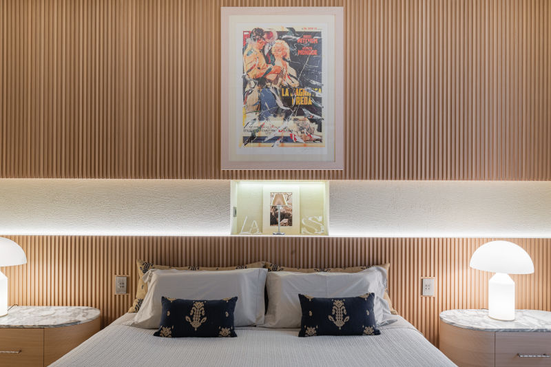 Nella camera padronale il letto è ridossato al centro di una parete rivestita con una boiserie realizzata con listelli analoghi a quelli utilizzati per la cucina. La boiserie sporge circa 5 cm dalla parete ed è interrotta da un taglio orizzontale per non perdere la nicchia preesistente al centro della parete e per consentire l’inserimento della retroilluminazione.