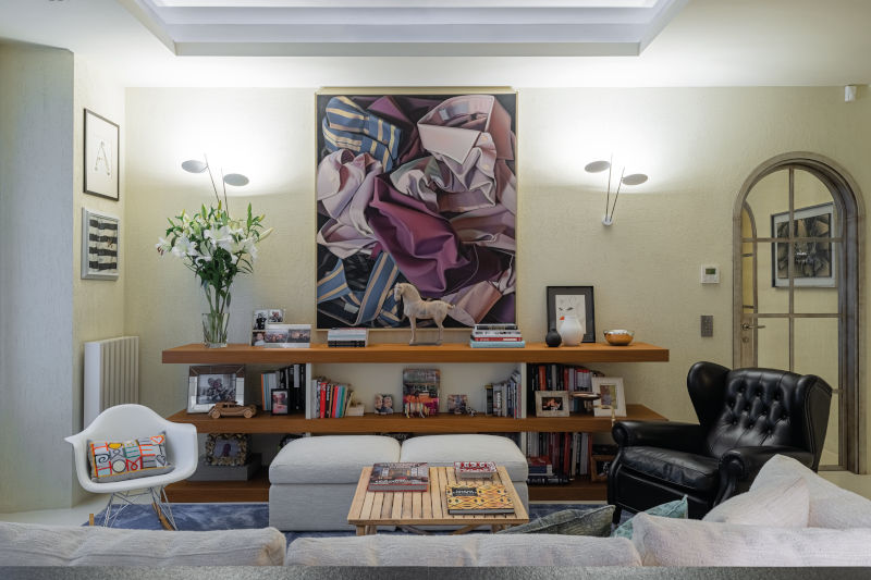 Il mobile del soggiorno, sul lato opposto alla cucina, è realizzato su progetto: nella parte centrale, sotto il quadro di Fortunato Depero, è meno profondo per consentire l’inserimento di uno schermo TV a scomparsa che si estrae tramite comando elettrico solo quando serve.