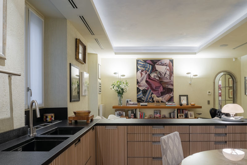 La cucina è realizzata artigianalmente su progetto dello stesso architetto: il piano di lavoro è in granito nero assoluto, mentre le basi sono in legno e il lato frontale è costituito da listelli di legno povero, normalmente utilizzati per l’anima di controbilanciatura delle porte, disposti verticalmente a comporre un disegno grafico che diventa elemento d’arredo.