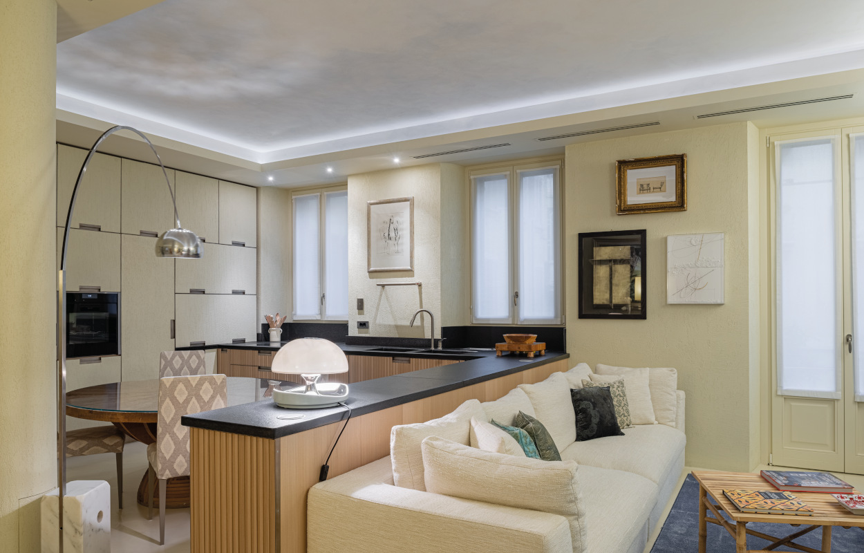 L’intervento ha portato all’eliminazione del corridoio, spazio di transito appartenente al passato, per ridisegnare ambienti più aperti e conformi agli stili di vita contemporanei, riorganizzando completamente le zone giorno in un unico grande spazio con cucina, pranzo e soggiorno, dedicato ai momenti condivisi della vita familiare.
