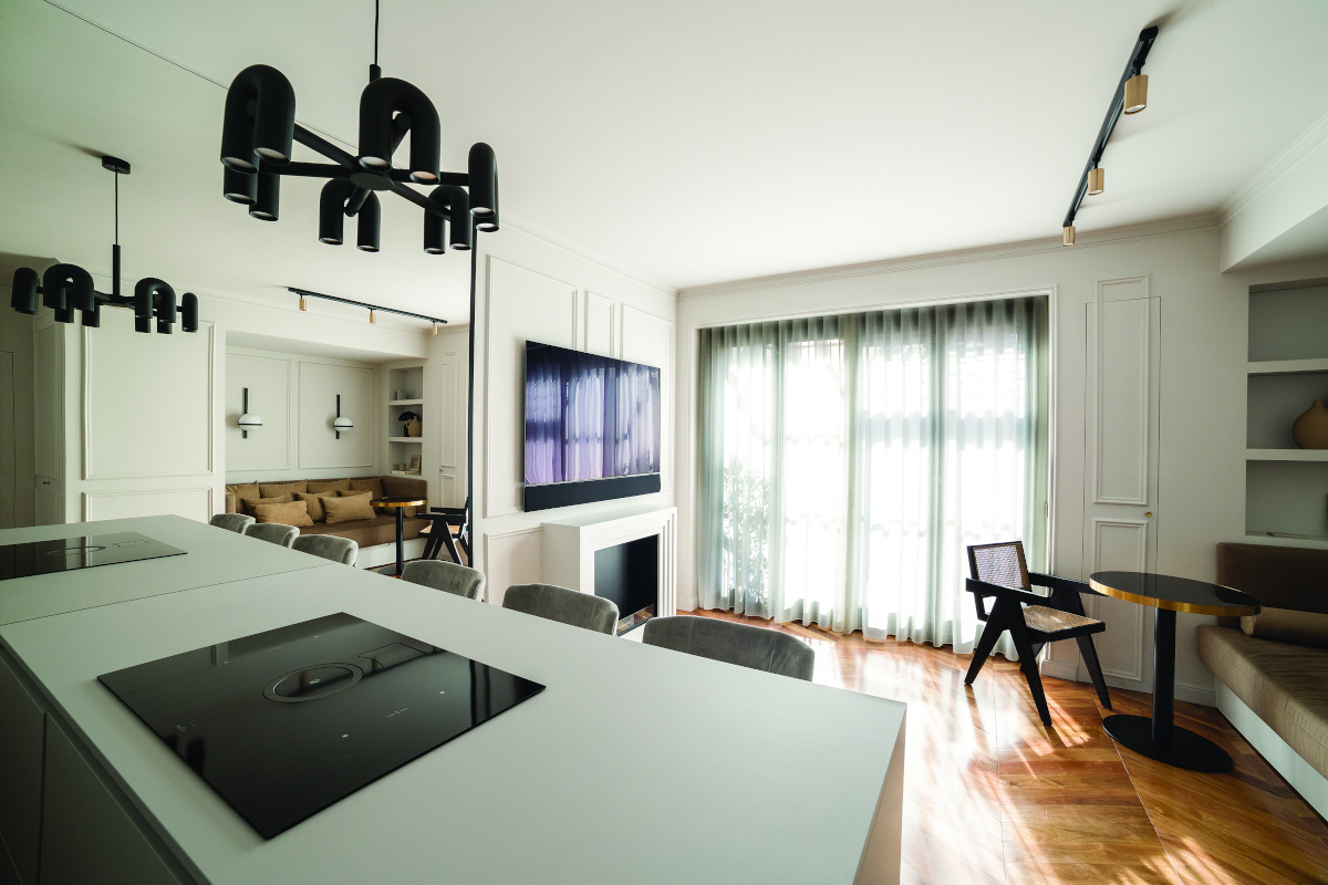 L’intero ambiente è caratterizzato da superfici decorate con boiserie ton sur ton bianco latte che, insieme al parquet posato a spina ungherese, attribuiscono allo spazio uno stile raffinato e classicheggiante.