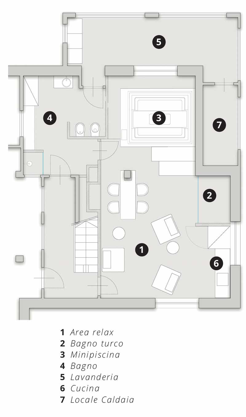 In realtà, l’idea iniziale era quella di installare soltanto una minipiscina di dimensioni generose da posizionare al centro del locale. Senonché, riflettendo con più calma, la padrona di casa si è resa conto che avrebbe desiderato un progetto di interni completo, con una zona per la preparazione di tisane e spuntini, un piano snack, spogliatoio, doccia e servizi, fino all’aggiunta di un hammam.