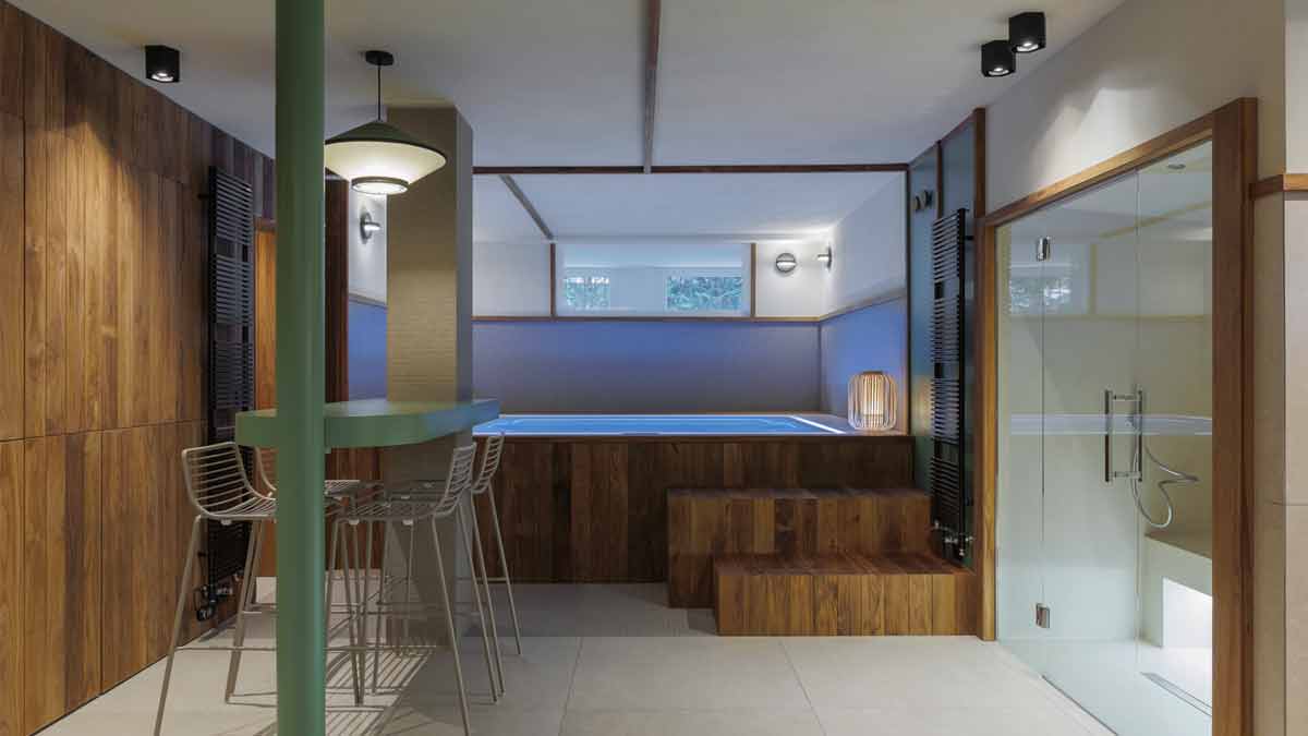 Anche l’illuminazione fornisce un apporto significativo alla sensazione di benessere, perciò si è fatto ricorso a corpi illuminanti in grado di enfatizzare alcune zone, come quella della piscina, di creare un legame, come il pendente posto sul piano snack tra il pilastro e il piantone, con in più la possibilità di modulare la scena attraverso fonti spostabili a piacere. Il comfort ambientale è garantito dalla presenza di un impianto di ventilazione e deumidificazione con estrazione del vapore.