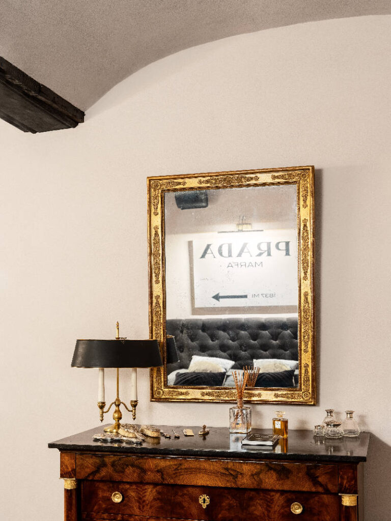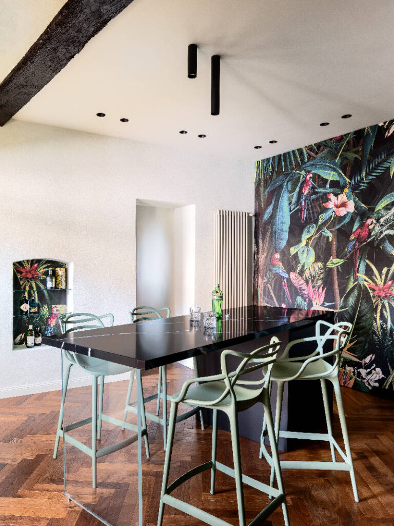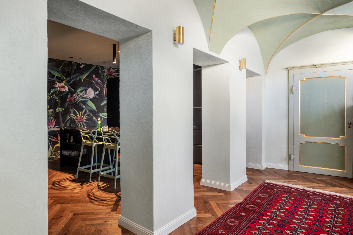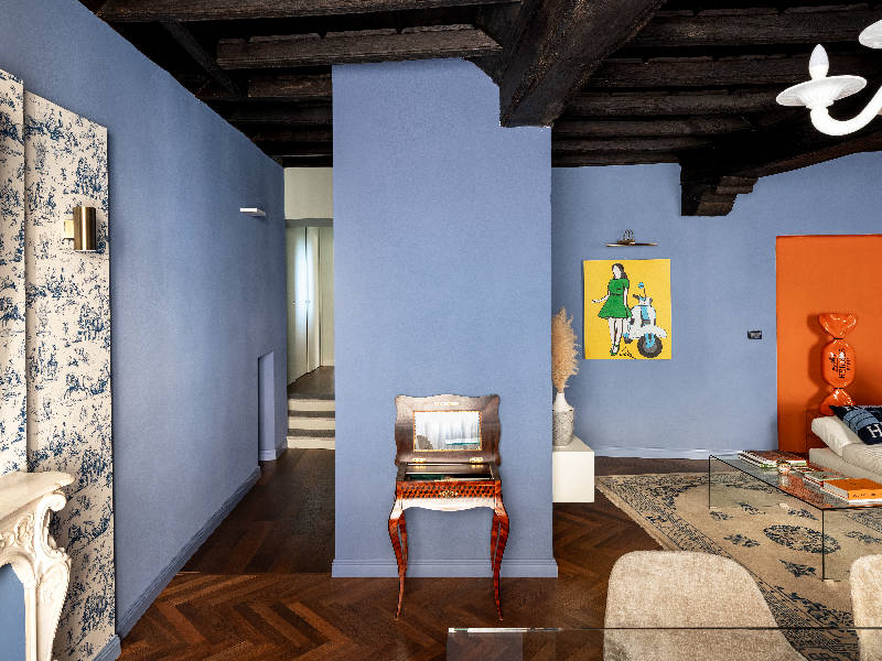 L’apparato decorativo complementare è costituito da diverse carte da parati, utilizzate nella cucina, nel bagno ospiti e nel soggiorno, dove riveste una boiserie realizzata per incorniciare il camino d’epoca in marmo che, insieme ad altri arredi e oggetti d’antiquariato, sottolinea l’identità storica del contesto.