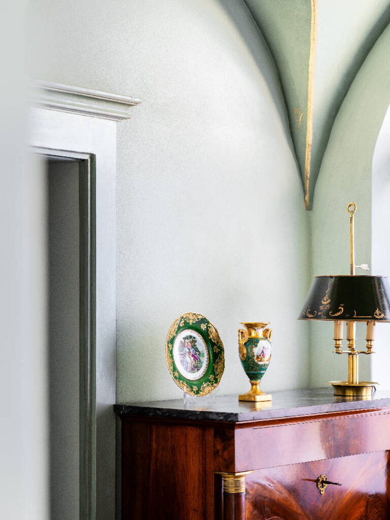 Degno di nota il secrétaire stile Impero e le ceramiche in porcellana fine bianca dipinte con smalti policromi e lumeggiature dorate, tutto di origine francese e dei primi dell‘800.