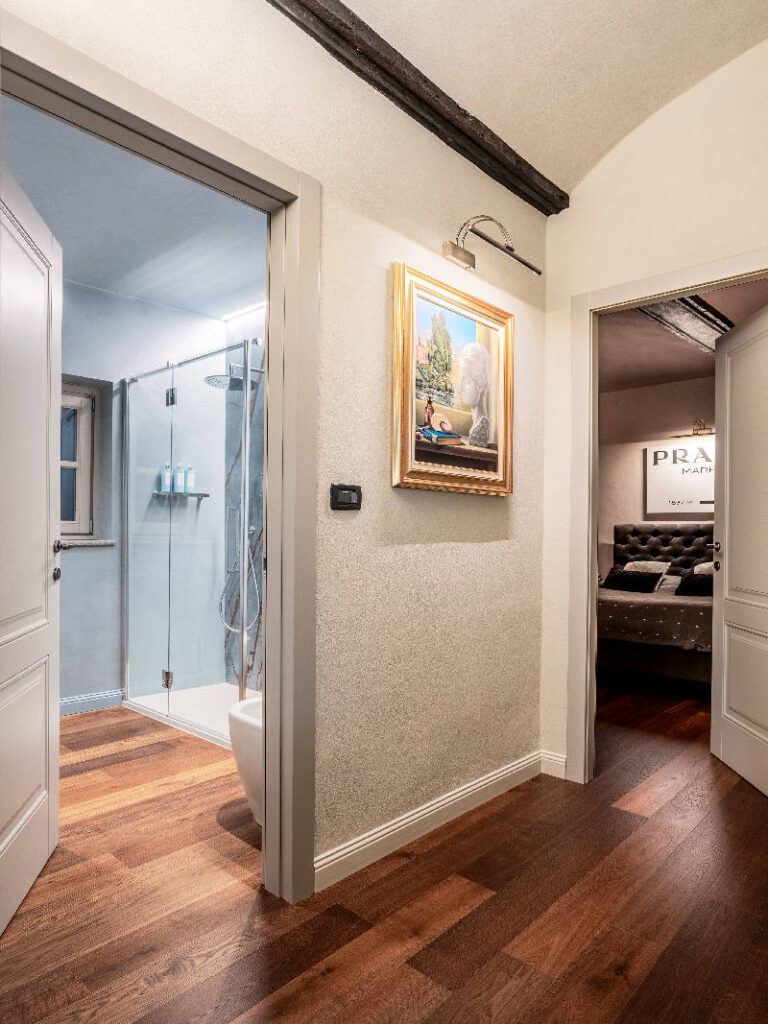 Il nuovo varco aperto per mettere in comunicazione diretta le due unità evidenzia l’imponenza del tessuto murario. Il tratto di corridoio in fondo ai gradini con pedate in luserna fiammata, come i davanzali, è frutto della riduzione della superficie del bagno preesistente, al cui posto ora ci sono uno sgabuzzino con lavatrice e asciugatrice sovrapposte e un bagno-boutique per gli ospiti.