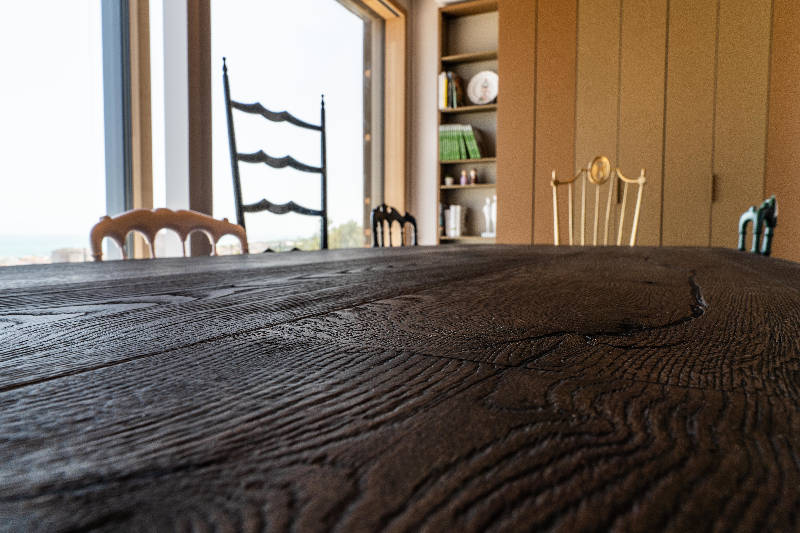 All’interno i telai dei serramenti (linea Garda di Essepi) sono in legno di betulla, all’esterno sono verniciati in una tonalità RAL canna di fucile. Il pavimento è in lastre di grès porcellanato rettificato 90×90 cm a effetto cemento. Le sedie chiavarine in legno e ottone, disposte attorno al tavolo Air di Lago, sono state ritrovate in soffitta, restaurate con tinte in tonalità pastello e arricchite con rivestimenti in velluto.