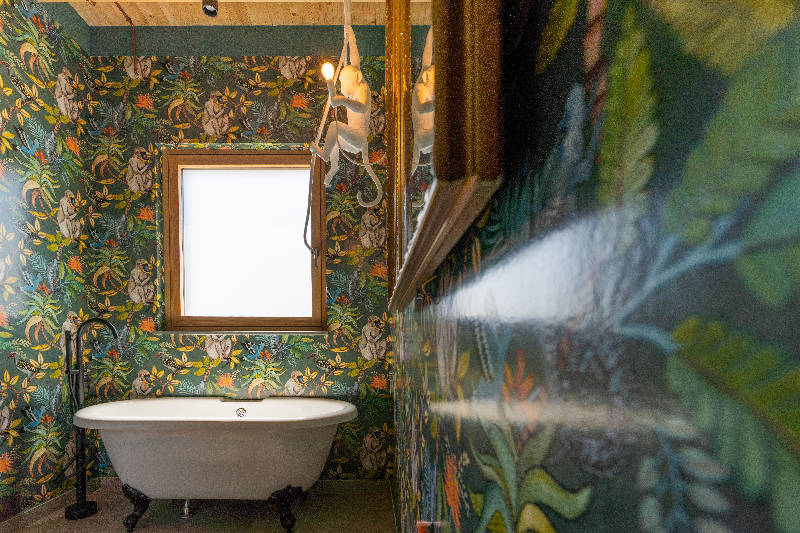 Le pareti del bagno sono rivestite a tutta altezza con una carta da parati di Cole & Son (soggetto Savuti) che crea un effetto giungla, sulla quale è stata successivamente stesa una resina bicomponente per impermeabilizzare le superfici; le sfumature azzurre ricordano il colore del mare, mentre la lampada sospesa in resina The Monkey Lamp di Seletti è un giocoso dettaglio che richiama le scimmie del rivestimento. La vasca da bagno che ricorda le tinozze del passato è di Rogier & Mothes.