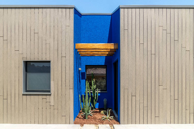 Le grandi travi in legno a taglio grezzo che sovrastano questo scorcio sono le estensioni del solaio interno e fungono da frangisole; la luce blu filtra all’interno, in particolare attraverso la porta finestra scorrevole della cucina, ed è particolarmente suggestiva.