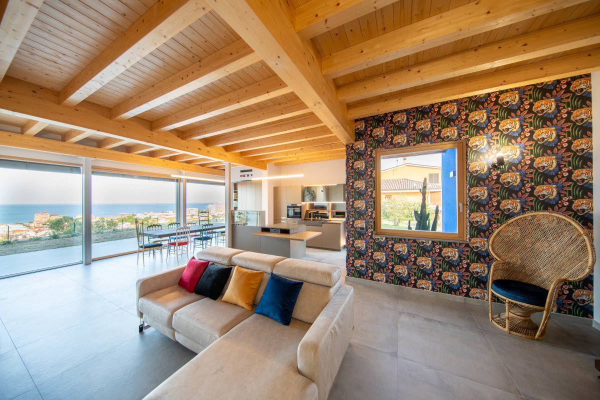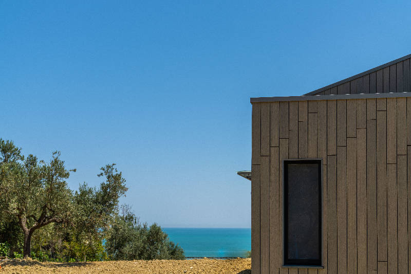 Esternamente questa villa in collina ha un design geometrico ed essenziale; richiama le abitazioni scandinave, ma gli interni esprimono calore e ricercatezza: il profumo del legno si mischia con quello della salsedine del mare di Roseto degli Abruzzi (TE), in fondo alla collina punteggiata da ulivi.