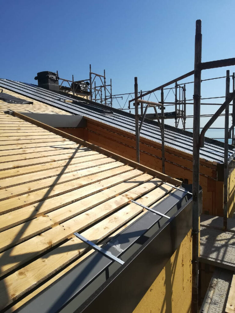 La ricostruzione ha privilegiato materiali e tecnologie costruttive ecosostenibili: la struttura è in legno X-Lam e i prospetti sono rivestiti con doghe di legno composito WPC disposte in verticale su una sottostruttura, per formare l’intercapedine di ventilazione che incrementa le prestazioni termiche e igrometriche dell’involucro.
