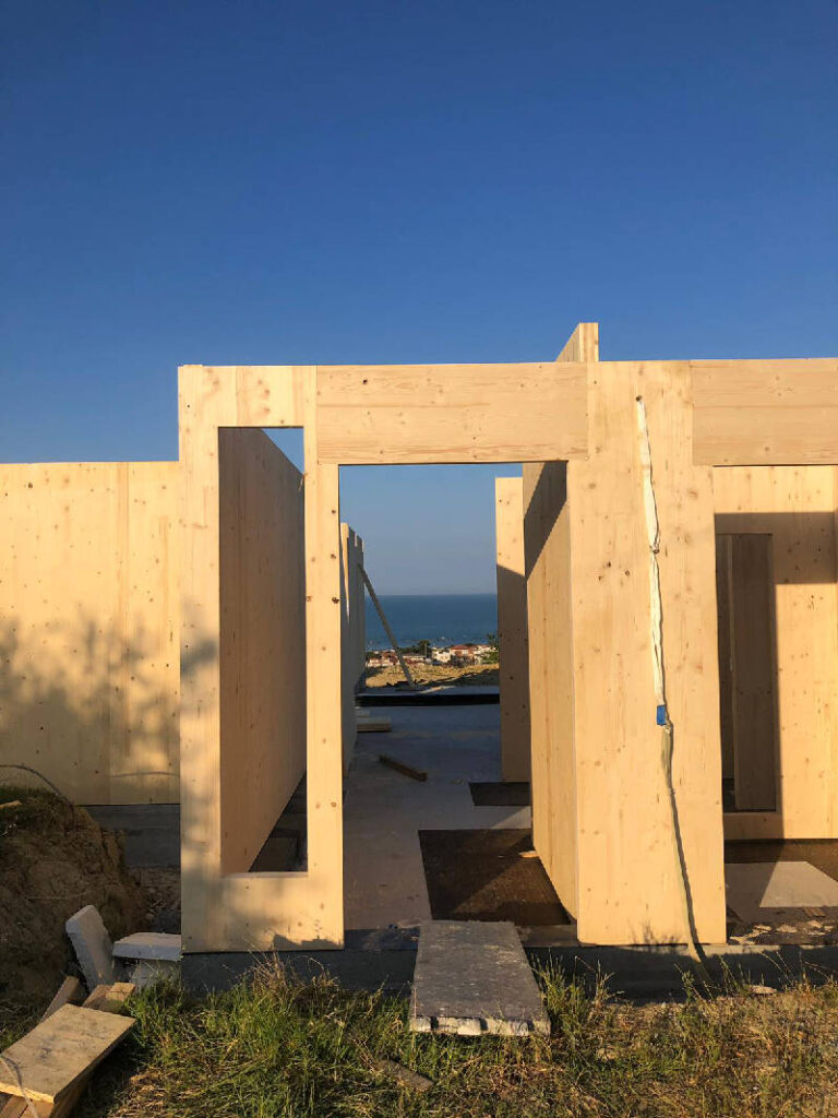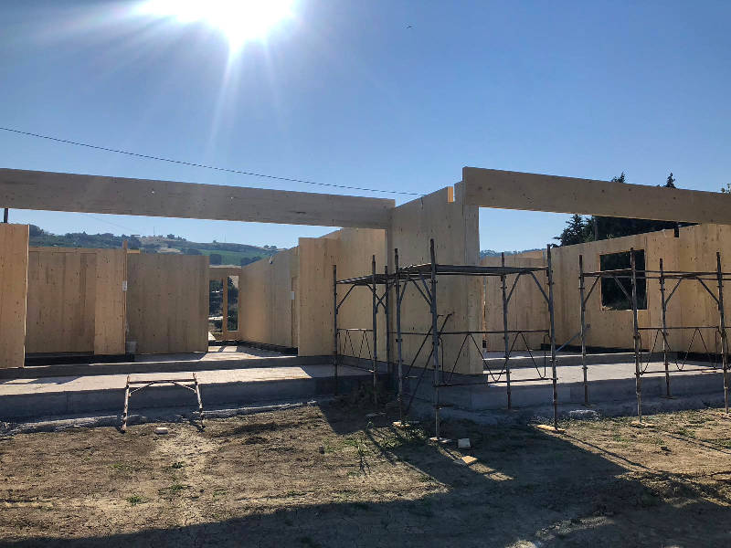 Le immagini riassumono alcune fasi dell’intervento: da sinistra, il rudere come si presentava prima di iniziare i lavori, la platea di fondazione (si nota la rientranza relativa al giardino d’inverno), le pareti dell’ingresso predisposte sul lato ovest, una visione d’insieme della struttura prefabbricata in pannellature di legno X-Lam e l’inizio della posa della copertura metallica.