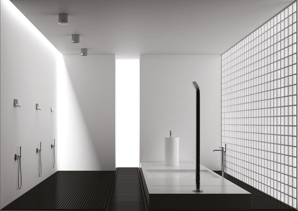 L’ambientazione firmata dall’architetto Marco Pisati aggiunge una lettura interessante. Il bagno viene immaginato come un luogo quasi rituale, costruito sul contrasto tra superfici scure e zone luminose, tra materia e leggerezza, tra energia e quiete. L’acqua diventa il filo conduttore di questo racconto spaziale: pioggia, cascata, getto diffuso contribuiscono a creare un’esperienza che coinvolge corpo e percezione.