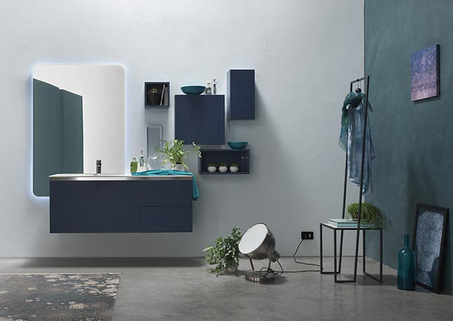 Le linee morbide si mixano ai contrasti cromatici per creare un’atmosfera dal fascino vintage. Il design di AK spazia da composizioni con anta liscia e maniglia in metallo o con maniglia a gola, a composizioni curve, a terra o con vani a giorno. Il tutto si adatta perfettamente al programma lavanderia. Tanti colori, nuove geometrie e volumi per portare nell’arredo bagno il proprio mondo. Le composizioni trasformano gli spazi e interpretano lo stile con accenti diversi.