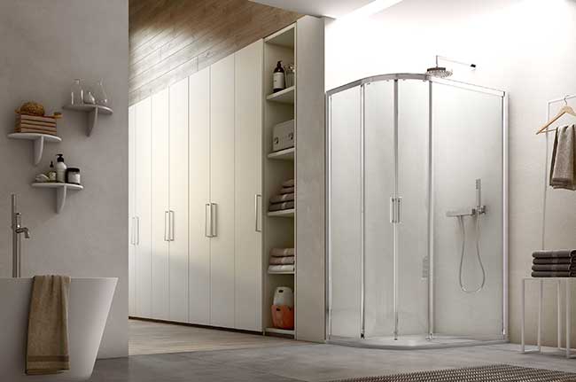 La versione semicircolare valorizza l’angolo con linee arrotondate e la scorrevolezza dell’apertura. Un’esigenza di spazio che diventa anche una scelta di stile