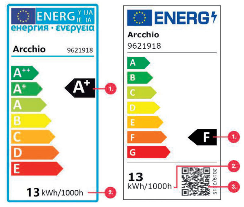 Fino ad agosto 2021, una lampadina con un consumo stimato di 13 kWh per 1.000 ore di accensione era classificata in classe A+; le classi erano 7, crescenti dalla A++ alla E