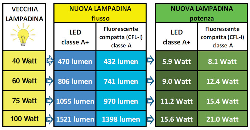 La tabella, che parte dalle principali lampadine a incandescenza utilizzate in ambito domestico, può essere d’aiuto per non avere sorprese: se, al posto di una lampadina da 60 W se ne vuole montare una a led di pari luminosìtà, bisogna sceglierne una che, indicativamente, emetta una luce da 806 lumen, ovvero che abbia una potenza di 9 W.