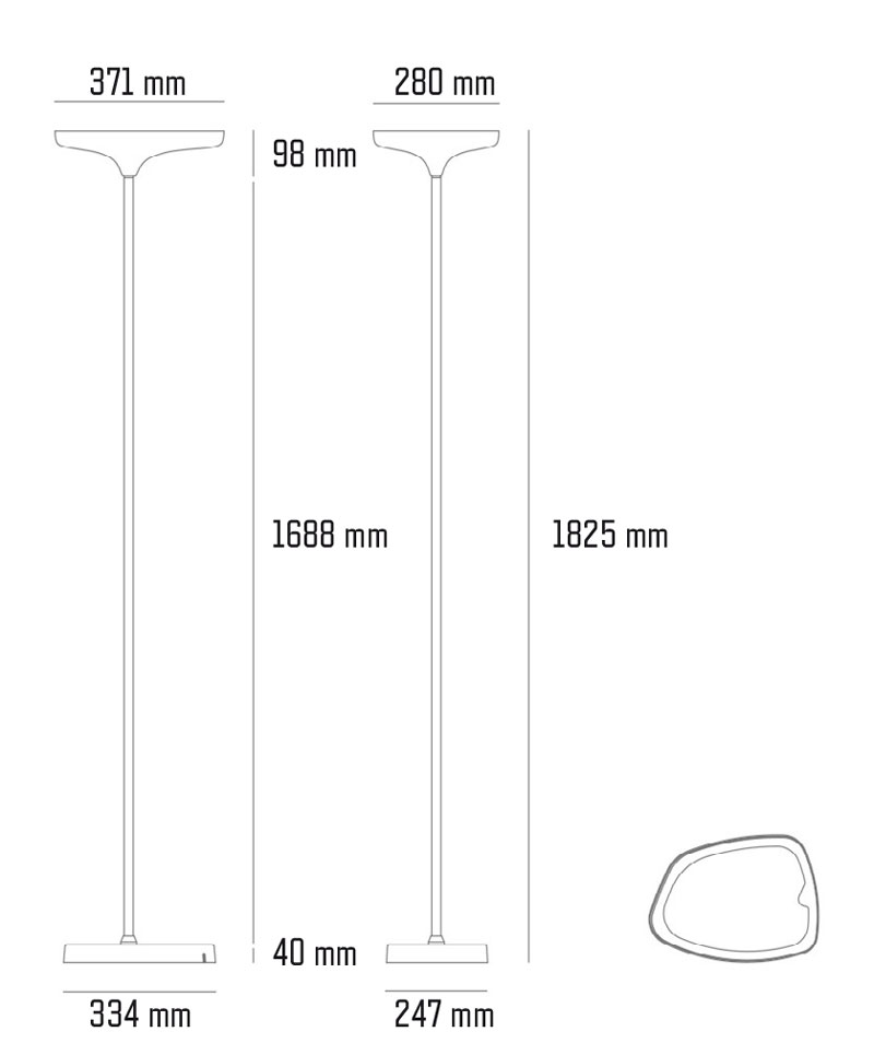 Lampada da terra che si sviluppa verso l’alto fino a 1740 mm di altezza diventando elemento d’arredo; corpo in PMMA lucido (nero o bianco), schermo diffusore in PMMA satinato, lampada da 25 W, colori RGBW, design Gianpietro Tonetti.