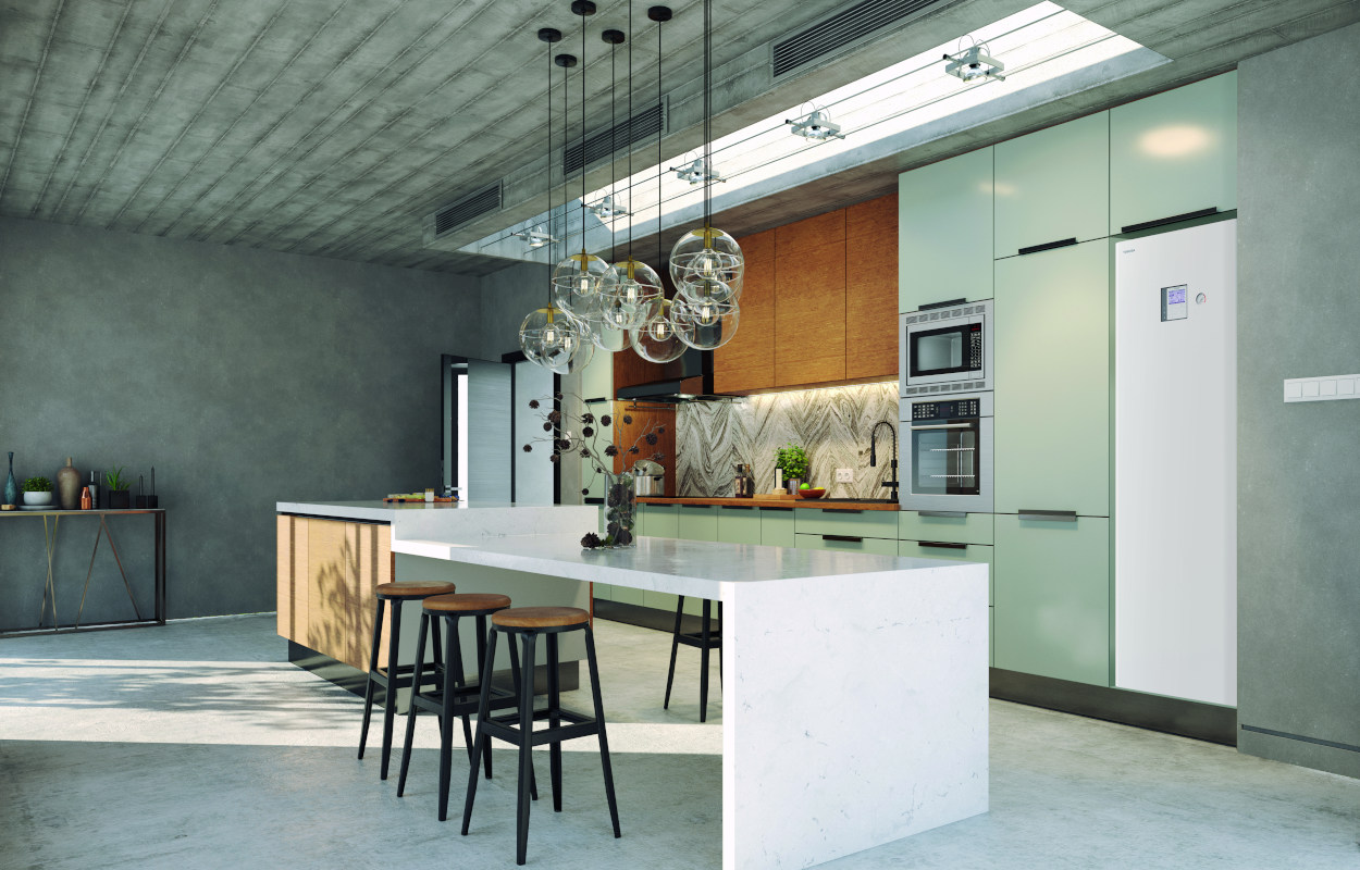 La seconda serie della pompa di calore aria/acqua Estìa All-in-One è una soluzione compatta a incasso dotata di bollitore integrato da 210 litri in acciaio inossidabile per la produzione di acqua calda sanitaria. Con un ingombro a terra di appena 595×670 mm, è costruita per integrarsi perfettamente a scomparsa in ambienti domestici come cucine, bagni, lavanderie.