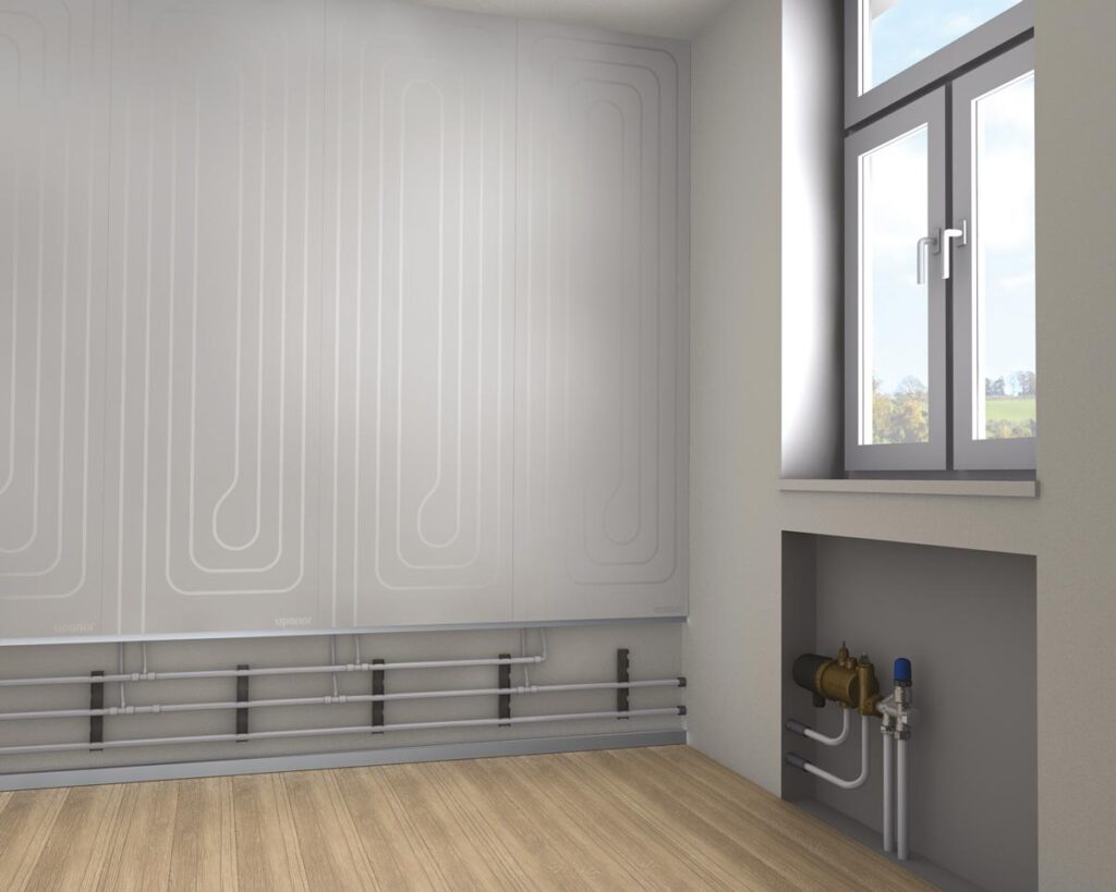 Il principale componente di Uponor Renovis è lo speciale pannello in cartongesso da 15 mm che racchiude al proprio interno la tubazione da 9,9 mm in polietilene reticolato PE-Xa. Ogni pannello include un circuito (di differenti lunghezze in base alla dimensione del pannello) che si collega facilmente mediante un tipico schema di collegamento per impianti di riscaldamento radiante. La tubazione incorporata non solo semplifica l’installazione ma consente di raggiungere la resa ottimale in tempi rapidi rendendo il pannello termicamente attivo in tutta la sua interezza.