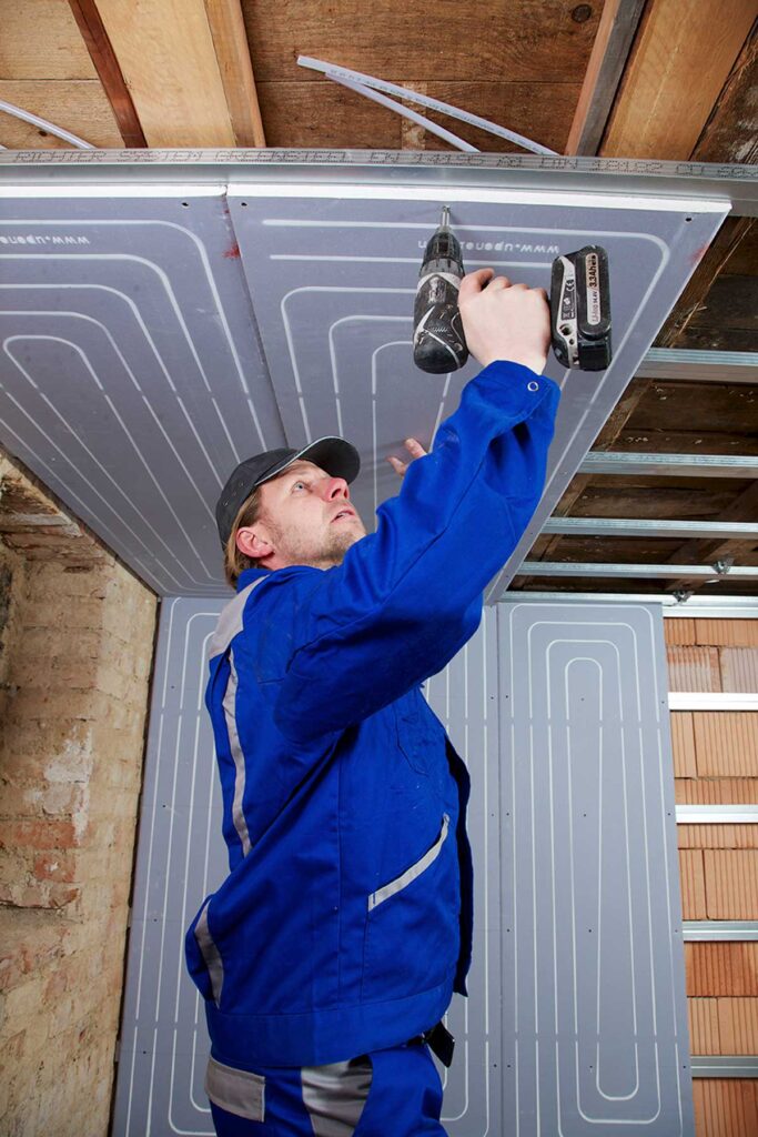 L’installazione dei pannelli Renovis si esegue tramite il fissaggio ai profili CD 27/60 normalmente utilizzati per strutture in cartongesso. Successivamente si procede alla realizzazione dell’impianto idraulico – è la medesima sia per il soffitto che per le pareti – con il collegamento dei circuiti dei pannelli al collettore di distribuzione eseguito secondo il classico schema Tichelmann, rendendo così estremamente semplice per gli installatori realizzare l’adattamento dei circuiti e la regolazione.