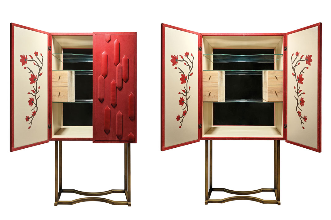 A fare da alfiere a tutta la collezione è il cabinet bar “Marcello”: seduttivo ed elegante, interamente lavorato a mano, si distingue per le linee raffinate e il rivestimento in pregiato camoscio color scarlatto. Le sue ante sono arricchite da applicazioni tridimensionali geometriche tono su tono, realizzate in diverse tipologie di pelle che creano un delicato contrasto di superfici. Aprendole si svela la loro lavorazione ad intarsio, che riproduce un ramo di ciliegio in fiore con petali, in diversi tipi di pellame, che si alternano in un elegante gioco cromatico. Sostenuto da una base in metallo con finitura ottone spazzolato, il punto forte del cabinet è proprio il suo interno in pelle color champagne, curato in ogni dettaglio e completato da mensole in vetro extra chiaro dal profilo sagomato. Caratterizzato da quattro cassetti in legno, il cabinet Marcello sprigiona anche un delicato profumo esotico. Il risultato? Un impatto che coinvolge i sensi: vista, tatto e olfatto.