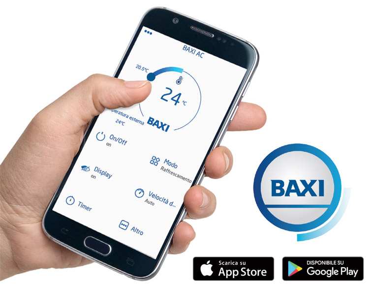 Il telecomando è dotato di un display a cristalli liquidi e di doppia tastiera con menù rapido; grazie al sistema Air Connect, il comfort può anche essere gestito da remoto tramite l’App Air Connect e il modulo Wi-Fi di serie che permettono di interagire con tutte le funzioni tramite smartphone o tablet. Il sistema Air Connect non comporta alcun impatto visivo, in quanto il modulo Wi-Fi viene inserito nell’apposita sede dietro il pannello frontale del climatizzatore e permette di controllare contemporaneamente con la medesima App più climatizzatori Baxi (provvisti dell’opportuno modulo WI-FI) e di disporre di tutte le funzioni del telecomando direttamente sul proprio dispositivo.