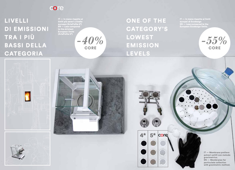 Con “Core”, una bellezza di fiamma che non ha uguali nel mondo del pellet si associa ad una combustione estremamente pulita ed efficiente, con livelli di emissioni estremamente ridotti. “Core” è il punto di arrivo di un lungo lavoro di ricerca orientato a ottimizzare la combustione da tre punti di vista: estetica, comfort e ambiente.
