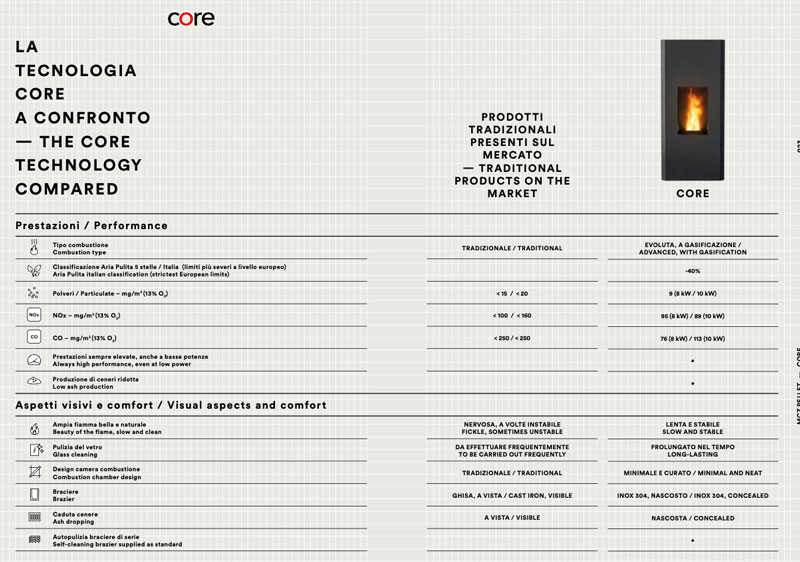 Ma perchè scegliere una stufa MCZ con tecnologia CORE? In una tabella il confronto con i tradizionali presenti sul mercato: